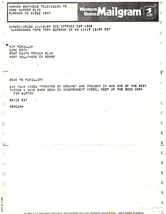 Tim Burton, fax adressé à Kim McKillip, circa 1989